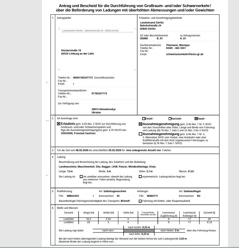 З виданим дозволом P70 ми подаємо заявку на отримання дозволу на здійснення негабаритних перевезень у Німеччині